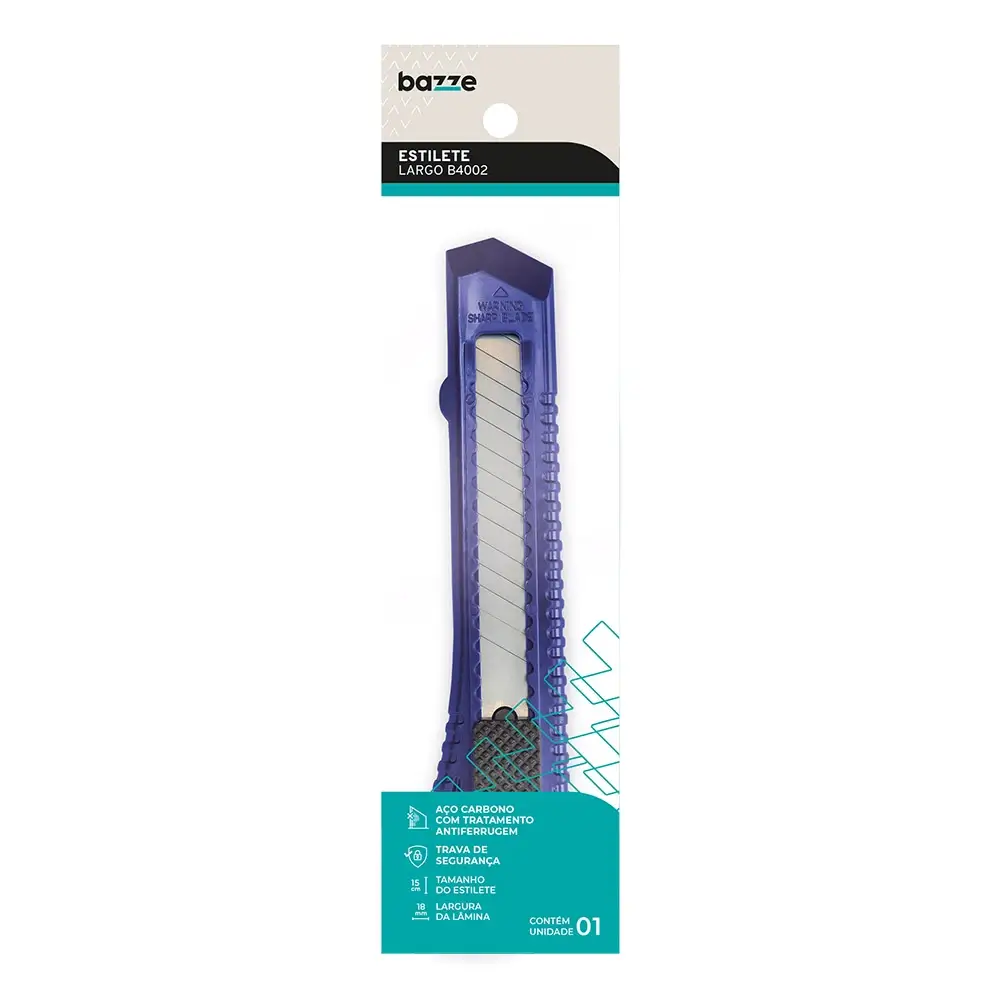 "O estilete B4002 possui corpo plástico, de lâmina larga e com tratamento antiferrugem. Possui trava de segurança e 15cm de comprimento. Para lâminas de 18mm. Cores sortidas."